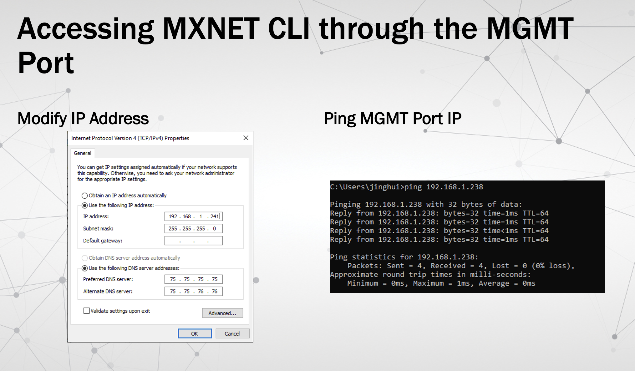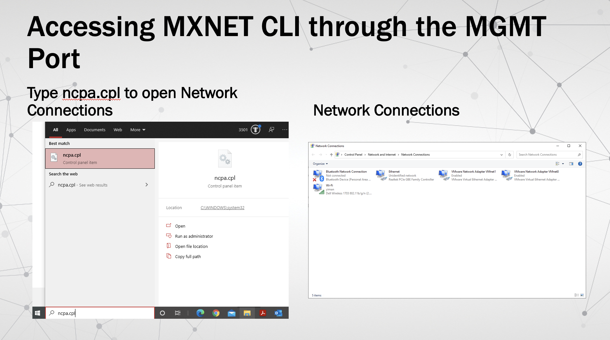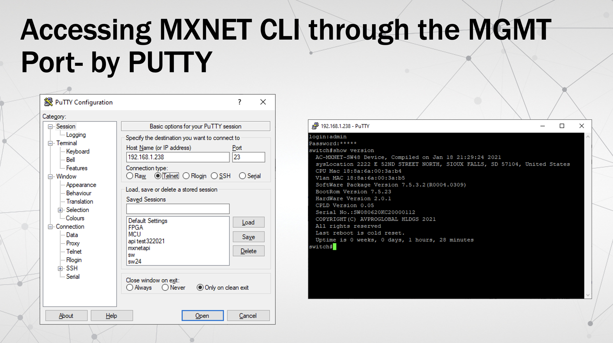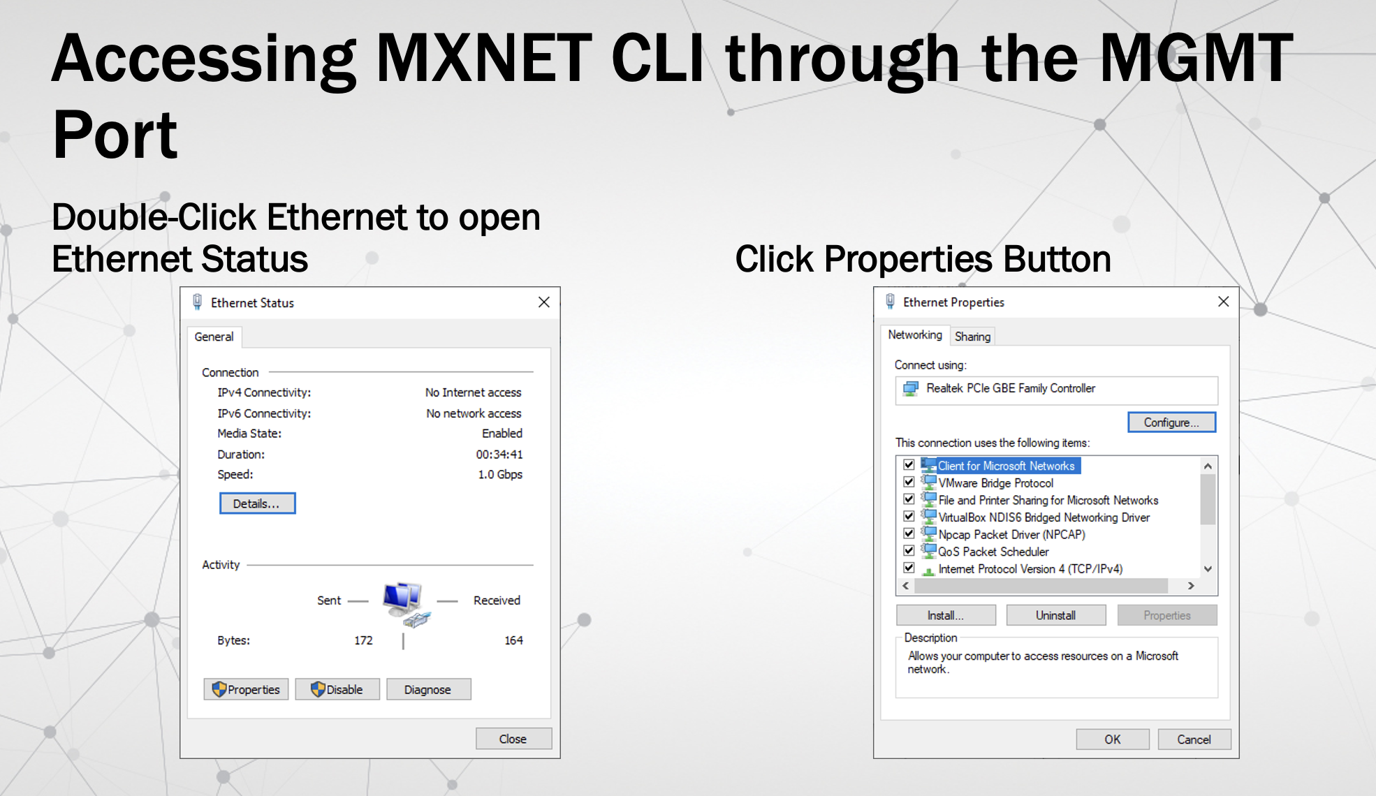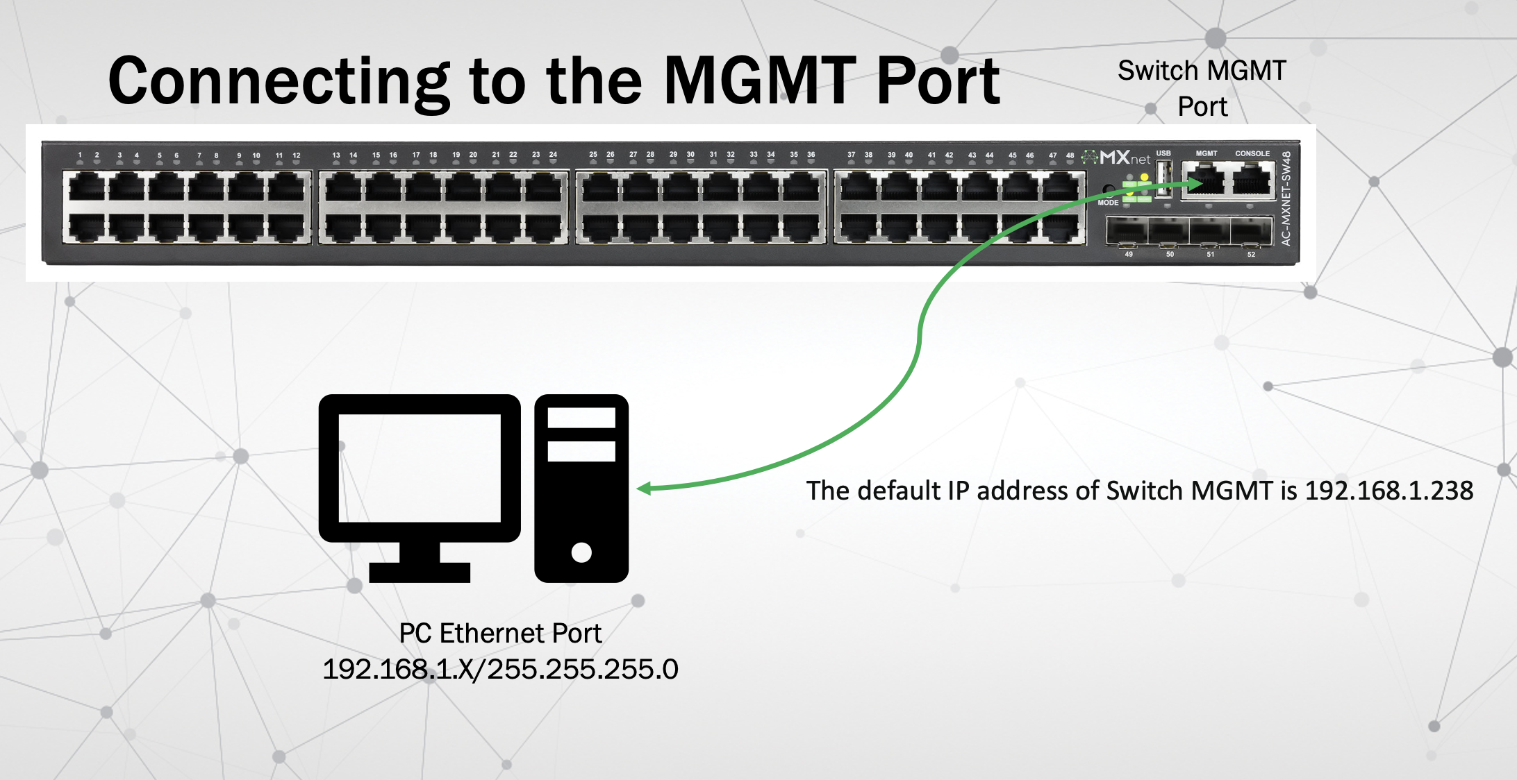 The MXNet switch has an RJ45 port labelled Mgmt which is the management port. You can access the management port by connecting a patch lead to the management port and connecting the other end to your computer.