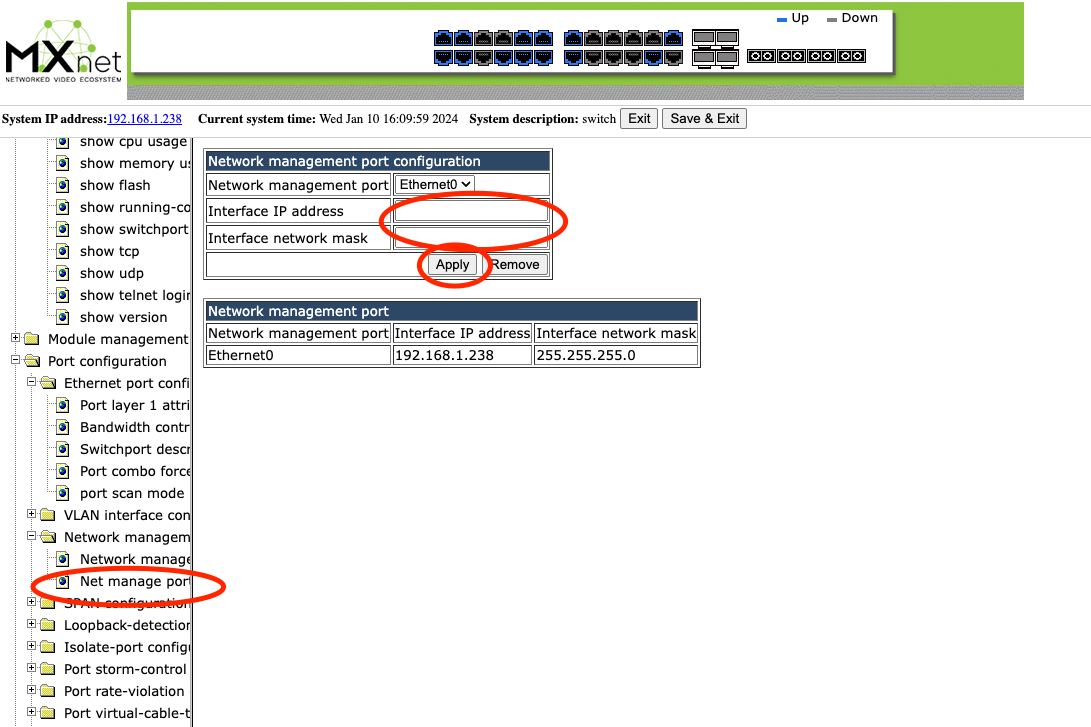 Then go to Network Management Port Configuration and set the IP address and network mask you want the switch to be on which is valid for your network and hit Apply. Now disconnect the patch lead from the switch to your computer and connect the switch management port to the main network or a better option is to plug it into one of the spare ports on the CBOX, Don't forget to set your computer back to DHCP and plug your computer into the main network and test to make sure you can now access the Management console of the MXNet Switch via the main network.